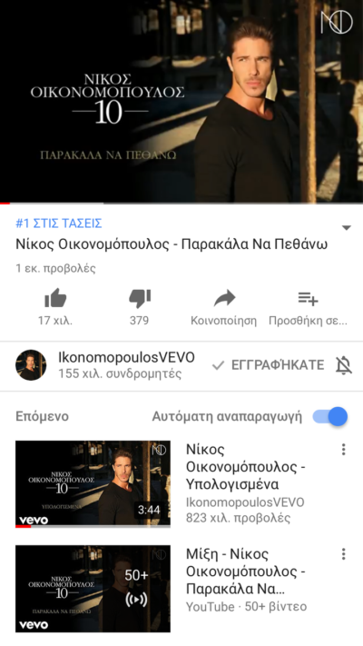 Μετά το «Για Κάποιο Λόγο» που εκτοξεύθηκε μέσα σε λίγες ώρες στο #1 των trends στο YouTube συγκεντρώνοντας μέσα σε 2 μήνες περισσότερες από 17.000.000 προβολές, αλλά και το «Υπολογισμένα», το ζεϊμπέκικο που έκλεψε τις εντυπώσεις από την 1η μέρα της κυκλοφορίας του, την κορυφή του YouTube «κλέβει» και τρίτο κομμάτι από το ολοκαίνουργιο album του Νίκου Οικονομόπουλου «10» που κυκλοφορεί από τη Minos EMI / Universal.