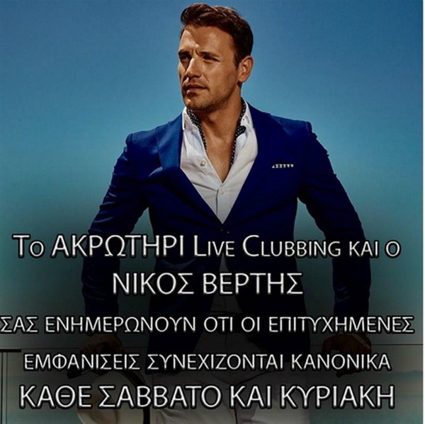 “Το Aκρωτήρι Live Club και ο Νίκος Βέρτης σας ενημερώνουν ότι οι επιτυχημένες εμφανίσεις συνεχίζονται κανονικά κάθε Σάββατο και Κυριακή”.