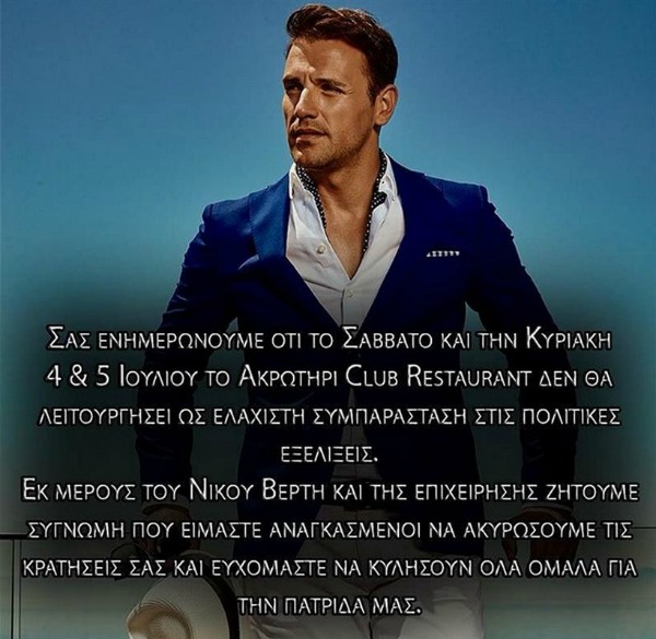 Μέσω των social media του καλοκαιρινού νυχτερινού μαγαζιού στο οποίο εμφανίζεται με τεράστια επιτυχία ο Νίκος Βέρτης το κοινό ενημερώθηκε για την πρωτοβουλία των υπευθύνων του να το κρατήσουν κλειστό για ένα Σαββατοκύριακο λόγω της πολιτικής αναταραχής στην Ελλάδα εν όψη δημοψηφίσματος.