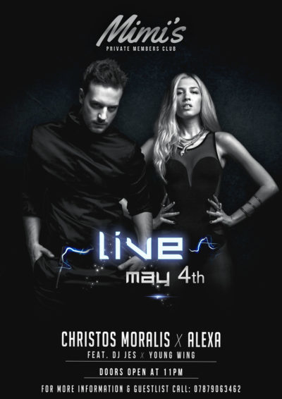 Ο Χρήστος Μόραλης και η Alexa συναντιούνται στην καρδιά του Λονδίνου της Αγγλίας, την Παρασκευή 4 Μαϊου, για μία μοναδική ζωντανή εμφάνιση. Οι δύο καλλιτέχνες παρουσιάζουν ένα εκρηκτικό Dance Live Party μέσα από ένα μουσικό ταξίδι στις επιτυχίες των 80’s, 90s, 00s αλλά και σύγχρονων δικών τους ήχων.