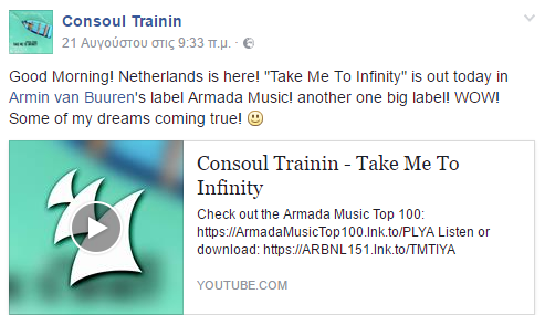 Το πρόσφατο single του με τίτλο “Take me to infinity” κυκλοφορεί τώρα και στην Ολλανδία μέσω της δισκογραφικής εταιρίας του σπουδαίου Dj Armin Van Buuren.