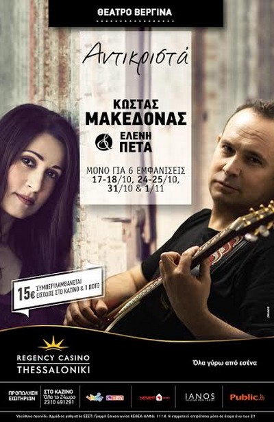 Στις 17 Οκτωβρίου το Θέατρο Βεργίνα του Regency Casino Thessaloniki, υποδέχεται τον Κώστα Μακεδόνα σε ένα υπέροχο μουσικό πρόγραμμα, γεμάτο ελληνικά τραγούδια του χθες και του σήμερα, γραμμένα για την αγάπη και την αμαρτία, τη ζήλεια και τον έρωτα, την πίστη και την προδοσία.