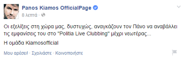 “Οι εξελίξεις στη χώρα μας, δυστυχώς, αναγκάζουν τον Πάνο να αναβάλλει τις εμφανίσεις του στο “Politia Live Clubbing” μέχρι νεωτέρας…
