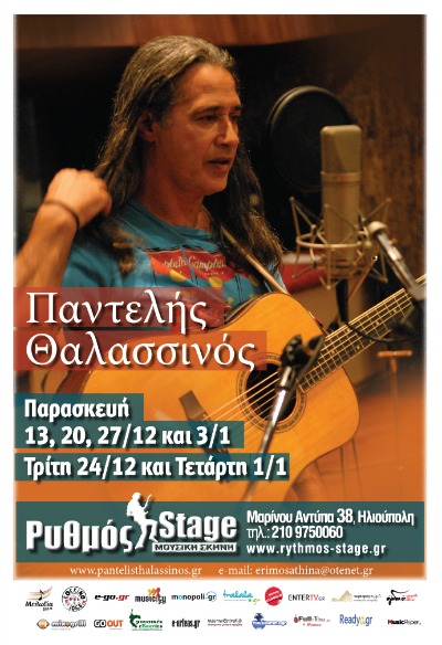 O Παντελής Θαλασσινός (www.pantelisthalassinos.gr) διαλέγει τις Παρασκευές από 13 Δεκεμβρίου έως και 3 Ιανουαρίου, αλλά και την παραμονή Χριστουγέννων και ανήμερα της Πρωτοχρονιάς, το χώρο του “Ρυθμός Stage”, και περιμένει τους φίλους του να τραγουδήσει και να επικοινωνήσει το καινούργιο του διπλό CD “Ανοιχτή Ακρόαση” μαζί με όλες του τις μεγάλες επιτυχίες.