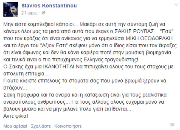 Ο Σταύρος Κωνσταντίνου γνωρίζει καλά το Σάκη Ρουβά καθώς στο ξεκίνημά του είχε κι εκείνος μάνατζερ τον Ηλία Ψινάκη. Τι λέει λοιπόν μέσα από την προσωπική του σελίδα στο facebook για όλους εκείνους που επιλέγουν να μη συμφωνούν με το εγχείρημα αυτό; Πως τους χαρακτηρίζει; Διαβάστε παρακάτω!