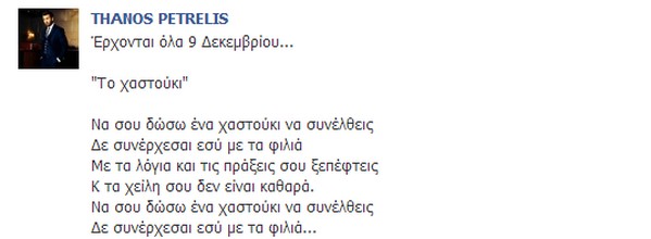 Μέσα από το προσωπικό του προφίλ, μας παρουσιάζει ένα ακόμα τραγούδι που θα περιλαμβάνει ο δίσκος, με τίτλο “Το χαστούκι”. Δείτε τους στίχους του τραγούδιού: