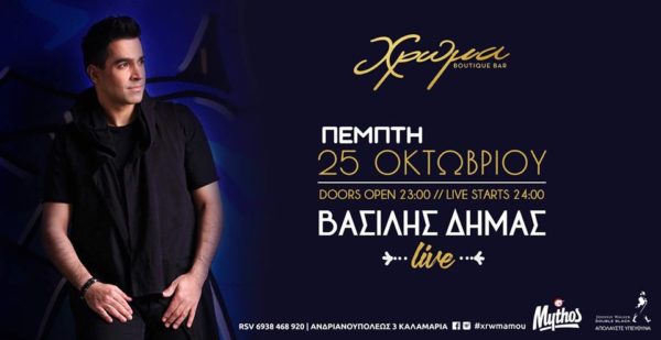 Από την Πέμπτη 25 Οκτωβρίου και κάθε Πέμπτη, το «Χρώμα» υποδέχεται τον Βασίλη Δήμα, στο απόλυτο live από νωρίς! Ένα live που υπόσχεται να σας κάνει να ξεχάσετε όλα όσα έχετε ζήσει μέχρι σήμερα, που θα γίνει θεσμός για τις Πέμπτες σας.