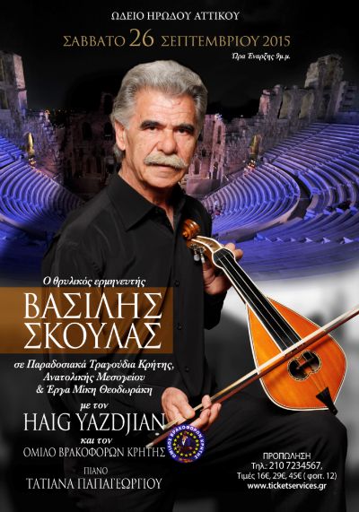 Μια αριστουργηματική παράσταση ετοιμάζει ο Βασίλης Σκουλάς για το κοινό του στο Ηρώδειο στις 26 Σεπτεμβρίου 2015 με τίτλο «Σε ρυθμούς της Νοτιοανατολικής Μεσογείου», με παραδοσιακά τραγούδια Κρήτης, Ανατολικής Μεσογείου και έργα Μίκη Θεοδωράκη. Η εντατική ενασχόληση του με το μεγάλο μουσικό κεφάλαιο Μίκης Θεοδωράκης τον φέρνει στην σκηνή του Ηρωδείου .