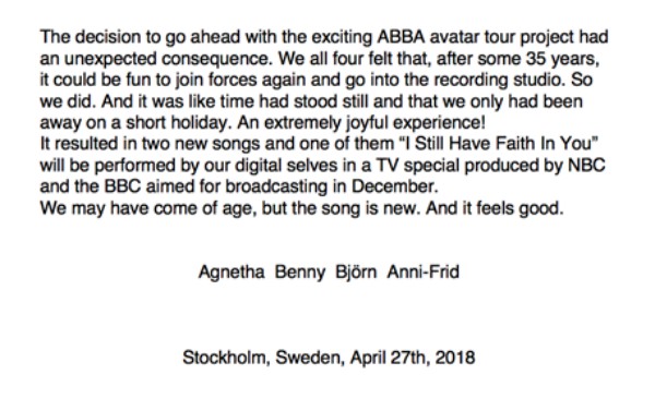 Μια εξαιρετικά διασκεδαστική εμπειρία. Το αποτέλεσμα ήταν δύο νέα τραγούδια και ένα από αυτά, το “I Still Have Faith In You”, θα παρουσιαστεί από τους ψηφιακούς εαυτούς μας σε ένα τηλεοπτικό πρόγραμμα του NBC και του BBC που θα μεταδοθεί τον Δεκέμβριο. Μπορεί να μεγαλώσαμε, αλλά το τραγούδι είναι καινούργιο. Και είναι υπέροχο»