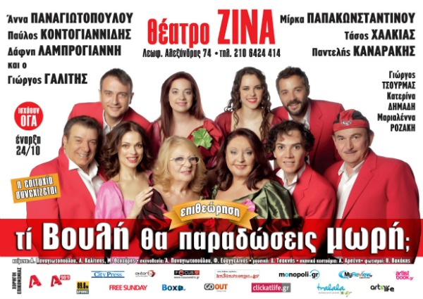 Μπορείτε να δείτε την Μίρκα Παπακωνσταντίνου και τους εξαιρετικούς συναδέλφους της στην παράσταση “Τι Βουλή Θα Παραδώσεις Μωρή;” στο Θέατρο Ζίνα από Τετάρτη έως και Κυριακή…