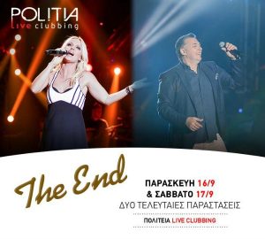 Το Σάββατο 17/9 το Politia Live Clubbing ρίχνει αυλαία με την Πέγκυ Ζήνα και τον Νίκο Μακρόπουλο να πραγματοποιούν τις τελευταίες του εμφανίσεις τη Παρασκευή 16/9 και το Σάββατο 17/9 στη Θεσσαλονίκη.