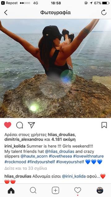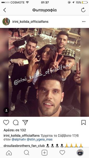 Η Ειρήνη Κολιδά, ξετρελαμένη με τον Κωνσταντίνο και Ηλία Δρούλια, την επόμενη κιόλας ημέρα ανάρτησε στο Instagram της τη φωτογραφία που μαρτυράει ότι είναι θαυμάστρια των Droulias Brothers φορώντας παντού το καπελάκι τους.