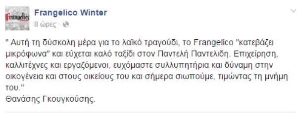 Πλήθος κόσμου σπεύδει να μοιραστεί μηνύματα αγάπης και συμπαράστασης προς την οικογένεια και τους φίλους του 33χρονου τραγουδιστή, ενώ δεν είναι λίγοι οι επώνυμοι που με ένα λιτό, σπαρακτικό μήνυμα στα social media θέλησαν να αποτίσουν φόρο τιμής στον επιτυχημένο καλλιτέχνη που ο κόσμος ανέδειξε. Μάλιστα ως ένδειξη πένθους και ύστερα από κοινή πρωτοβουλία καλλιτεχνών και επιχειρηματιών πολλά είναι τα νυχτερινά μαγαζιά σε Αθήνα και Θεσσαλονίκη που θα παραμείνουν κλειστά αυτό το Σαββατοκύριακο.