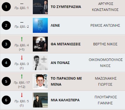 Απ’ την κορυφή βγάζει το “Συμπέρασμά” του ο Κωνσταντίνος Αργυρός, ο οποίος για άλλη μία εβδομάδα βρίσκεται στο Νο.1 με τη νέα του μεγάλη επιτυχία. Μία θέση πιο κάτω το “Λένε” του Αντώνη Ρέμου που συνεχίζει να διαγράφει εξαιρετική πορεία χωρίς να έχει απουσιάσει από το chart ούτε μία εβδομάδα από το ντεμπούτο του και μετά αρκετούς μήνες πριν. Στο νούμερο 3, ο Νίκος Βέρτης με το “Θα Μετανιώσεις”, τραγούδι από το νέο του album. Αλλά και ο Νίκος Οικονομόπουλος δε θα μπορούσε να λείπει από το Top5… μας τραγουδά “Αν Πονάς” και βρίσκεται στην 4η θέση. Το Top5 αποδεικνύεται ανδρική υπόθεση και έρχεται να το ολοκληρώσει ο Γιώργος Μαζωνάκης με το τραγούδι του “Το παράξενο με μένα”. Αξίζει να σημειωθεί πως το τραγούδι αυτό παρουσίασε τη μεγαλύτερη άνοδο αυτή την εβδομάδα, καθώς ανέβηκε 12 ολόκληρες θέσεις.