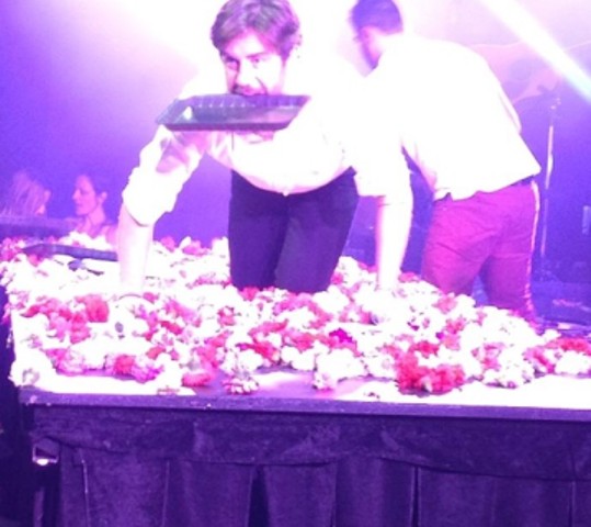 πέρα από τον Γιώργο Μαζωνάκη! Πάντα κάνει κάτι προκειμένου να μας κεντρίσει το ενδιαφέρον είτε με την εμφάνισή του και τις στυλιστικές του επιλογές, είτε με τα τραγούδια και τις δηλώσεις του. Αυτή την φορά αποφάσισε να πέσει στα πατώματα του κέντρου όπου τραγουδάει και να περιπλανηθεί με έναν δίσκο από λουλούδια στο στόμα του.