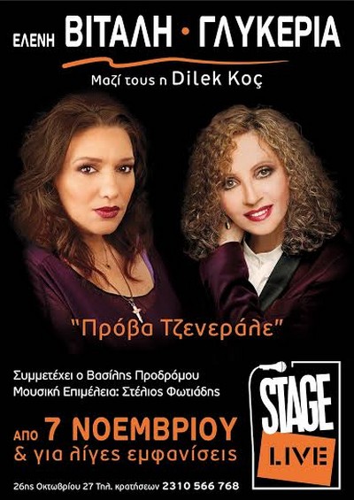 Η Ελένη Βιτάλη και η Γλυκερία, δύο κορυφαίες ερμηνεύτριες, ενώνουν τις μαγικές φωνές τους, σε μια πρωτότυπη μουσική παράσταση, που ανεβαίνει στη μουσική σκηνή Stage στη Θεσσαλονίκη από τις 7 Νοεμβρίου.