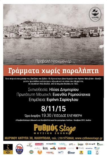 Την Κυριακή 8 Νοεμβρίου 2015 και ώρα 19:30, θα προβληθεί το ιστορικό ντοκιμαντέρ «Γράμματα Χωρίς Παραλήπτη». Η είσοδος είναι ελεύθερη.
