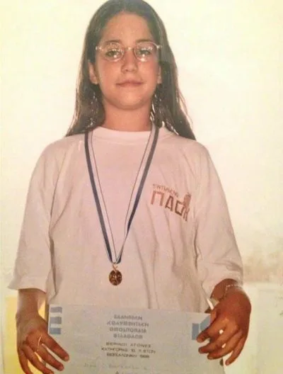 Στη φωτογραφία η Κατερίνα σε αρκετά μικρή ηλικία με γυαλιά οράσεως λαμβάνει μετάλλιο ύστερα από τη συμμετοχή της σε κάποιους αγώνες. Όπως είναι γνωστό, άλλωστε, έχει ασχοληθεί με επιτυχία με την κολύμβηση στη γενέτειρά της, τη Θεσσαλονίκη, και ήταν μέλος της ομάδας του ΠΑΟΚ.