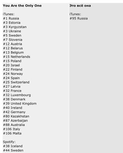 Το τραγούδι με το οποίο εκπροσώπησε τα χρώματα της χώρας του το “You are the only one”, για το οποίο συνεργάστηκε με τον Δημήτρη Κοντόπουλο και στη σκηνή με το Φωκά Ευαγγελινό, έκανε δυναμική είσοδο στα iTunes charts πολλών χωρών από τη πρώτη μέρα κυκλοφορίας και από τότε η άνοδος του συνεχίζεται σταθερά. Ανάμεσα τους φυσικά και η πατρίδα του Ρωσία.