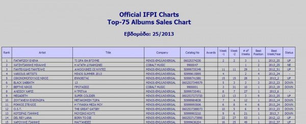 Κάθε βδομάδα παίρνουμε μια ιδέα από το Τop-75 πωλήσεων των albums στην Ελλάδα και όπως φαίνεται την κορυφή έχει κατακτήσει το νέο album της Έλενας Παπαρίζου, με τίτλο «Τι ώρα θα βγούμε;»!