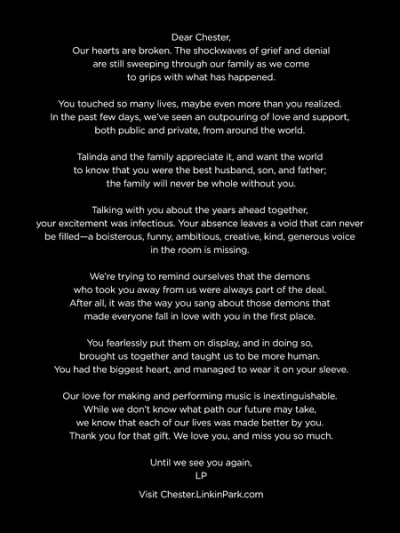 Με ένα μακροσκελές κείμενο, οι Linkin Park μίλησαν με λόγια που ταξίδεψαν σε μικρό χρονικό διάστημα σε όλο το κόσμο και συγκίνησαν. Για το τι θα κάνει στη συνέχεια το group επισήμανε το εξής: “Η αγάπη μας για τη δημιουργία και εκτέλεση της μουσικής δεν σβήνει. Δεν ξέρουμε ποια θα είναι η πορεία μας και το μέλλον μας, αυτό που ξέρουμε είναι ότι η ζωή μας έγινε καλύτερη χάρις σε εσένα.”