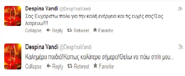 Σήμερα, το πρωί, ενώ βρίσκεται ήδη μία ημέρα στο νοσοκομείο, η αγαπημένη τραγουδίστρια έστειλε μηνύματα στους θαυμαστές της, από τον προσωπικό της λογαριασμό στο twitter, και τους ενημέρωσε για την κατάσταση της υγείας της. Φυσικά, οι απαντήσεις και οι ευχές για ανάρρωση από όσους την αγαπούν, έπεσαν βροχή!
