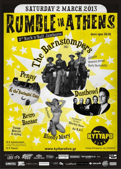 νοιώθοντας την αίσθηση της ανατριχίλας, με μηχανοδηγό τους Dustbowl ,(Αθήνα) και επιβάτη τη φωνή/πειρασμό μιας γάτας…Penny & the Swingin’ Cats , (Αθήνα) που σε πλανεύει σε μια άλλη εποχή… Soundtrack η μουσική των Hillbillies της Αμερικανικής υπαίθρου κάπου στην αυγή των θρυλικών 50’s… Country Boogie, Western Swing, Honky Tonk – Rockabilly από τους ταξιδιώτες στον χρόνο Barnstompers (Ολλανδία), που έρχονται για πρώτη φορά στην Ελλάδα! Όλα αυτά στο RUMBLE IN ATHENS #2 που έχει γίνει θεσμός στην Αθήνα και συνεχίζεται για δεύτερη χρονιά ,φυσικά στο ΚΥΤΤΑΡΟ LIVE. “Κλείστε θέσεις” τώρα και ζήστε την γοητευτική και μαγευτική απόλαυση αυτού του ταξιδιού!!!