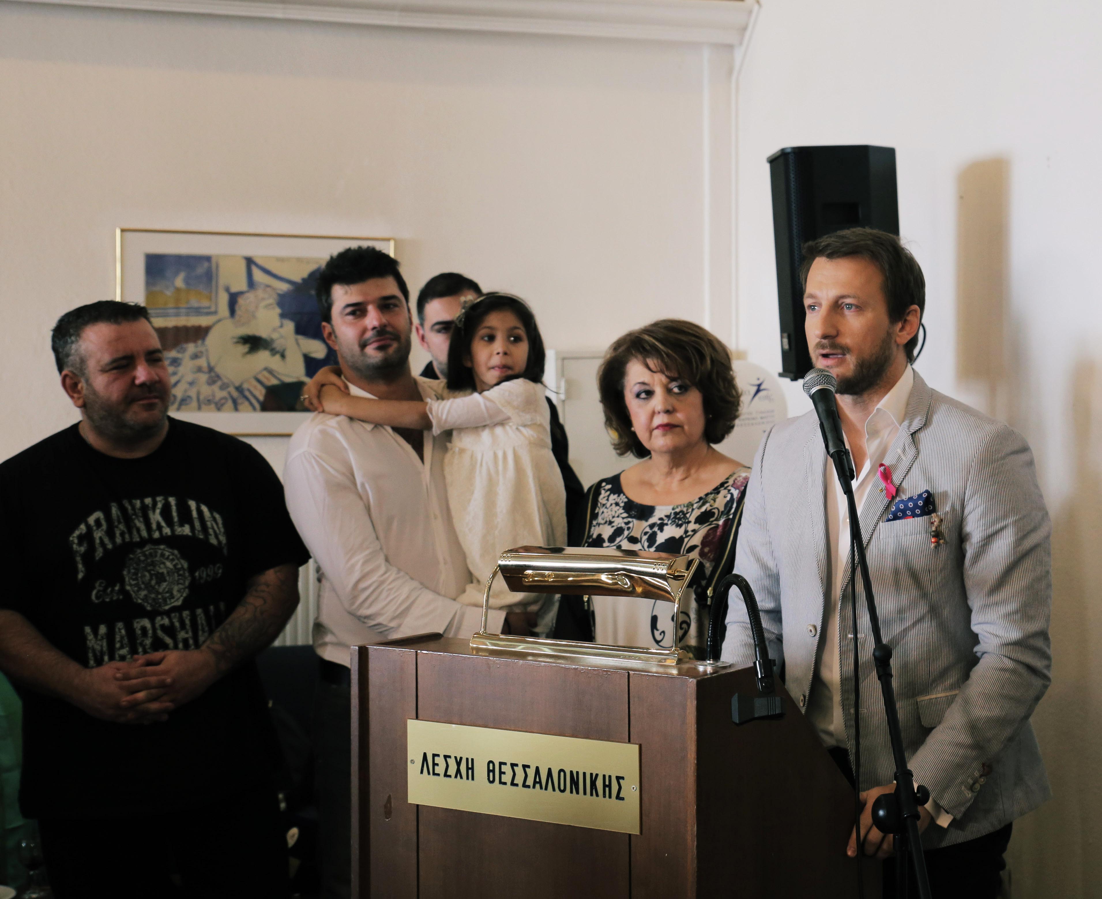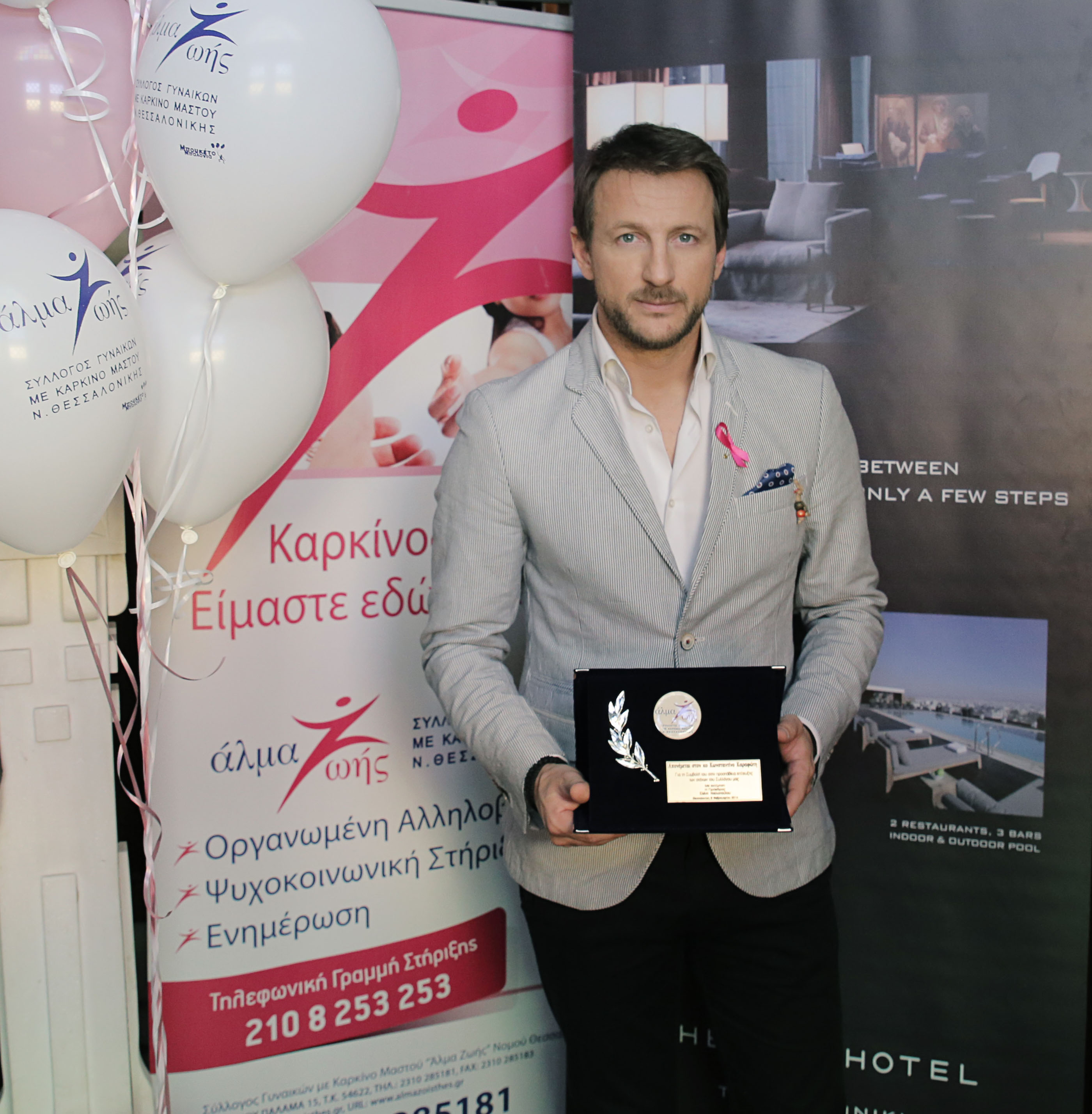 Η πρόεδρος του «ΑΛΜΑ ΖΩΗΣ» Νομού Θεσσαλονίκης, κα Ντελιοπούλου Ελένη, καλωσόρισε τον τραγουδιστή στην εκδήλωση και του απένειμε τιμητική πλακέτα για την πολύτιμη προσφορά του στον Σύλλογο. Ο τραγουδιστής χάρισε την φωνή του στο τραγούδι-ύμνο του Συλλόγου, σε μουσική Ιορδάνη Παύλου και στίχους Γιάννη Μαλλιά, το οποίο θα συμπεριληφθεί ως bonus track στην νέα δισκογραφική δουλειά του . Όπως είπε και ο ίδιος «Εγώ δεν έχω κάνει τίποτα περαιτέρω απ’ το να τραγουδήσω τους στίχους , το οποίο μου πήρε 2 ώρες απ’ τον χρόνο μου, με σκοπό να δώσουμε όλοι μαζί ένα πολύ αισιόδοξο μήνυμα. Εγώ δηλώνω εθελοντής του συλλόγου και θα είμαι δίπλα σε κάθε προσπάθεια σας. Το χειροκρότημα δεν είναι για εμένα, είναι για όλες εσάς που καθημερινά παλεύετε για να βγείτε νικήτριες». O Σύλλογος Γυναικών με Καρκίνο Μαστού «Άλμα Ζωής» Nομού Θεσσαλονίκης ιδρύθηκε με πρωτοβουλία του Πανελλήνιου Συλλόγου Γυναικών με Καρκίνο Μαστου “Άλμα Ζωής” σε συνεργασία με μια ομάδα γυναικών απο τη Θεσσαλονίκη. Σκοπός του Συλλόγου είναι η οργανωμένη αλληλοβοήθεια, η ψυχοκοινωνική στήριξη και αποκατάσταση των γυναικών που πάσχουν όπως επίσης και των μελών των οικογενειών τους, η συμβολή του στην απομυθοποίηση του καρκίνου και η ενημέρωση του γυναικείου πληθυσμού για την πρόληψη και έγκαιρη διάγνωση της ασθένειας.