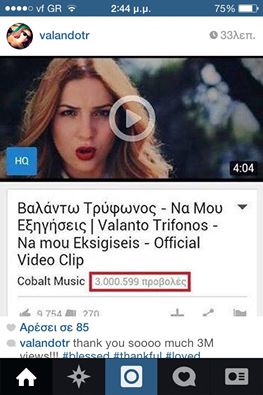 Η Βαλάντω Τρύφωνος μέσα από τον λογαριασμό της στο instagram μοιράστηκε με τους διαδικτυακούς φίλους και θαυμαστές της μία φωτογραφία στην οποία φαίνεται ο αριθμός προβολών του επιτυχημένου της video clip ”Να μου εξηγήσεις”. Το τραγούδι αυτό αγαπήθηκε πολύ από το κοινό όσο και το video clip του, που ξεπέρασε τα 3.000.600 views στο επίσημο κανάλι της cobalt στο youtube.