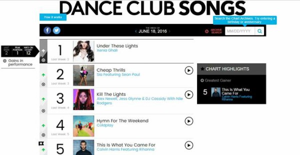 Μετά από μήνες ανοδικής πορείας στο Billboard Dance Chart η Ελληνίδα dj και μουσική παραγωγός Xenia Ghali κατάφερε να φτάσει στην κορυφή αφήνοντας πίσω καλλιτέχνες όπως η Sia, οι Coldplay, ο Calvin Harris, η Rihanna, οι Nervo και ο Sean Paul.